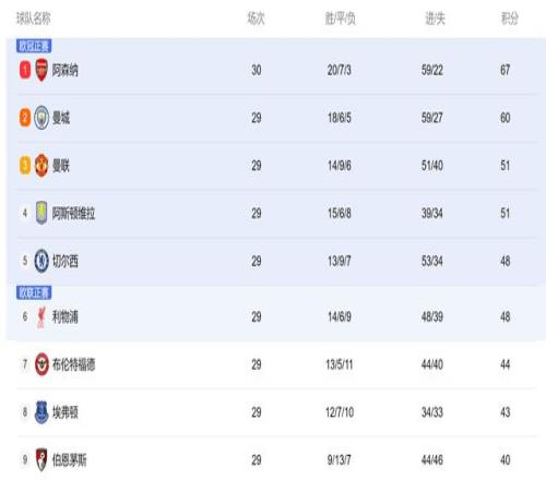 這樣多場比賽之后,英超最新積分榜出爐。加上前一天利物浦被狼隊2-1擊敗,最新的競爭形勢是,多賽一場的阿森納67分穩(wěn)居第一。曼城緊隨其后60分排名第2,曼聯(lián)、阿斯頓維拉拿到51個積分,分列第3、第4,而身后兩大豪門切爾西、利物浦同積48分,對歐冠區(qū)域虎視眈眈。