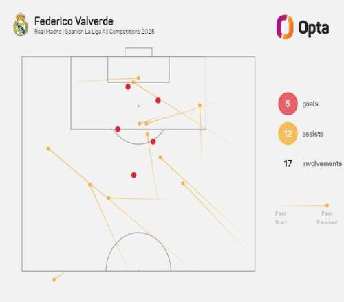 至此,巴爾韋德本賽季代表皇家馬德里在各項賽事已直接參與17球(5球12助),追平皇馬生涯單賽季第二多參與進球紀錄(2024-25賽季也是17球),僅次于2022-23賽季的19球。
