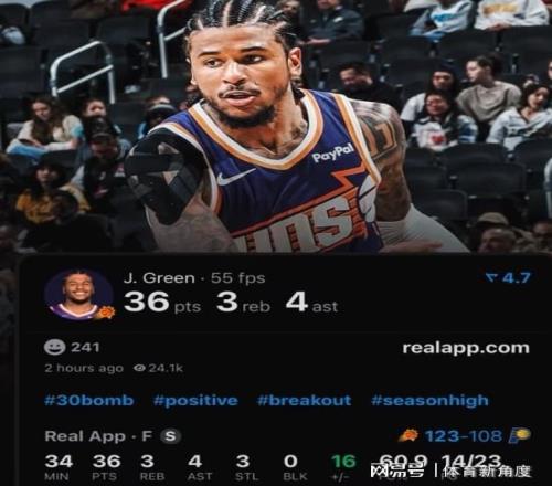 面對(duì)步行者,杰倫-格林出戰(zhàn)34分鐘,23投14中,三分9中3,罰球7中5,砍下了賽季新高的36分,還有3個(gè)籃板4次助攻3次搶斷,正負(fù)值高達(dá)+16。今天,無疑是杰倫-格林在太陽隊(duì)的代表作之一,在此之前,他在太陽的最高得分是29分。