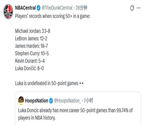 球星50+分戰(zhàn)績曝光!喬丹23勝8負(fù)詹姆斯12勝2負(fù)東契奇8戰(zhàn)全勝