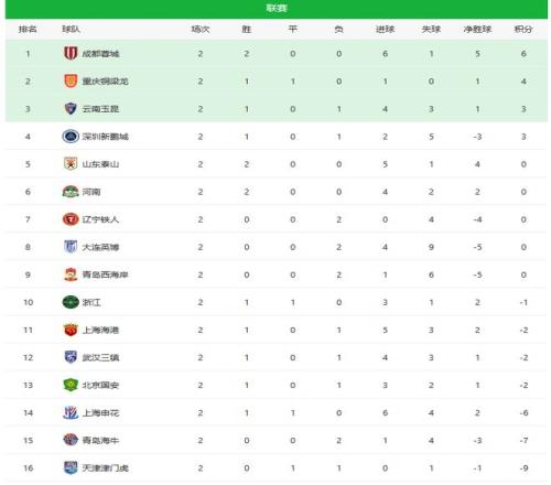 中超第二輪綜述及積分榜,泰山隊(duì)第5,成都領(lǐng)跑,四隊(duì)兩連敗