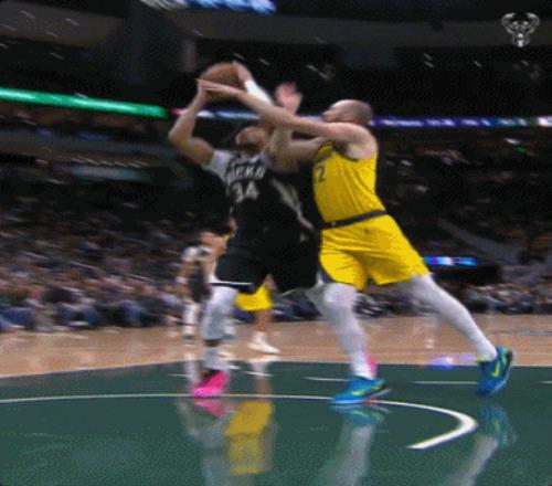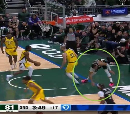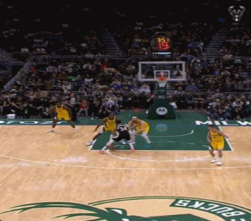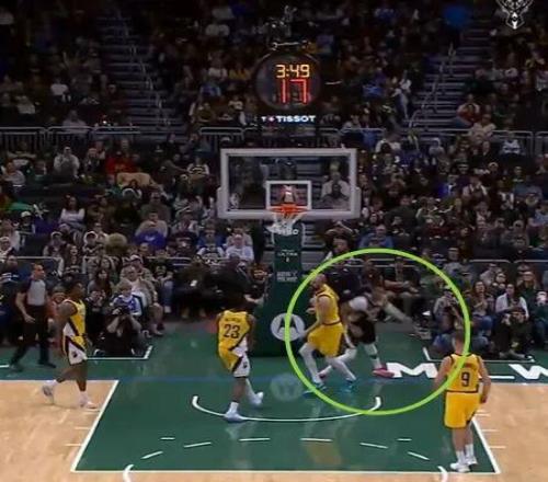 值得一提的是,字母哥因為意外受傷,一直就在前場沒有參與退防,步行者進攻失誤后,雄鹿一個長傳正好給到了前場的字母哥。