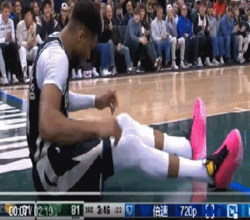 第三節(jié),字母哥一個轉身殘暴扣籃后落地失衡,疑似崴腳受傷