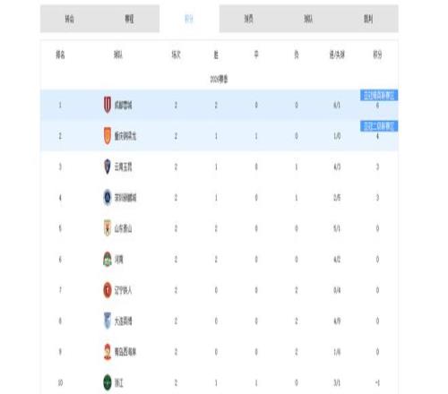 兩輪過后,成都蓉城豪取兩連勝,凈勝5球,凈勝球數(shù)位列第一,同時以6分成績領跑積分榜。