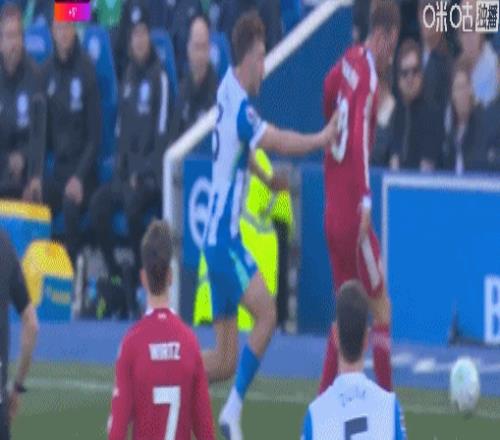 第34分鐘,明特禁區(qū)內(nèi)倒地,斯洛特在場邊投訴他假摔