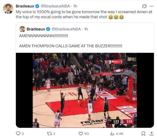 在阿門(mén)完成補(bǔ)籃絕殺后休媒高呼:明天我的嗓子肯定會(huì)啞掉,就像阿門(mén)拼命的去幫杜蘭特補(bǔ)籃一樣,我也一直在為他尖叫。
