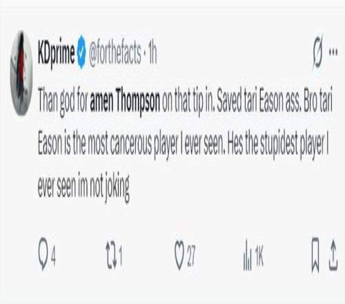 杜蘭特球迷:感謝GOD讓阿門(mén)補(bǔ)救了這一切,他救了伊森的命?;镉?jì)們,伊森是我見(jiàn)過(guò)最危險(xiǎn)的球員也是最愚蠢的,我不是在開(kāi)玩笑。
