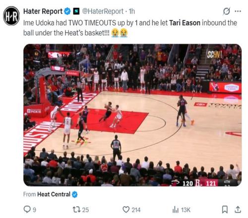 美媒嘲諷烏度卡:火箭還剩下兩個(gè)暫停,在伊森失去發(fā)球空間的情況下不叫,結(jié)果伊森助攻熱火籃下接球反超。