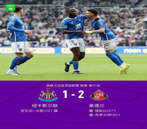北京時間3月22日,英格蘭足球頂級聯(lián)賽第31輪,紐卡斯爾聯(lián)主場對陣桑德蘭。比賽中,安東尼-戈登抓住奧尼安失誤首開記錄,塔勒比角球亂戰(zhàn)扳平比分,布羅貝伊獻絕殺。最終,桑德蘭2-1聯(lián)賽雙殺紐卡。