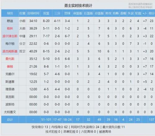 勇士本場(chǎng)10人輪換,除了梅爾頓和斯潘塞之外,其余8人得分上雙:穆迪23分、波爾津吉斯22分、波杰姆斯基20分、小佩頓17分、桑托斯16分、LJ-克賴爾14分、追夢(mèng)11分、理查德10分。梅爾頓6中0,僅得0分6板5助3斷7失誤。