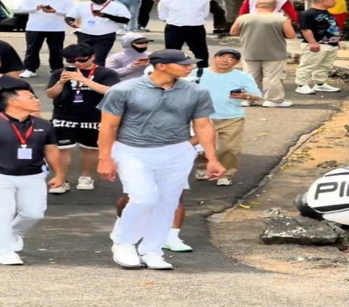 這是一場規(guī)格極高的職業(yè)業(yè)余配對賽,他一身專業(yè)的高爾夫行頭,揮桿動作舒展漂亮,完全是以一個純粹的體育愛好者的身份在享受競技。