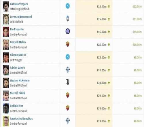 本期意甲身價漲幅榜前十