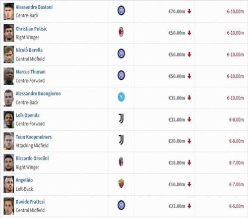 本期意甲身價跌幅榜前十
