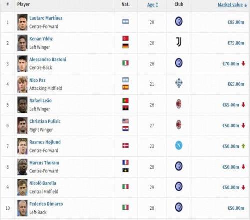 本期德轉(zhuǎn)意甲身價前十