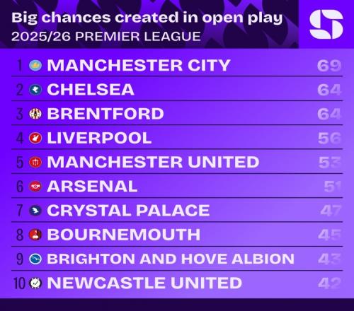 本賽季英超球隊(duì)運(yùn)動(dòng)戰(zhàn)創(chuàng)造重大機(jī)會(huì)榜:曼城69次居首,阿森納51次