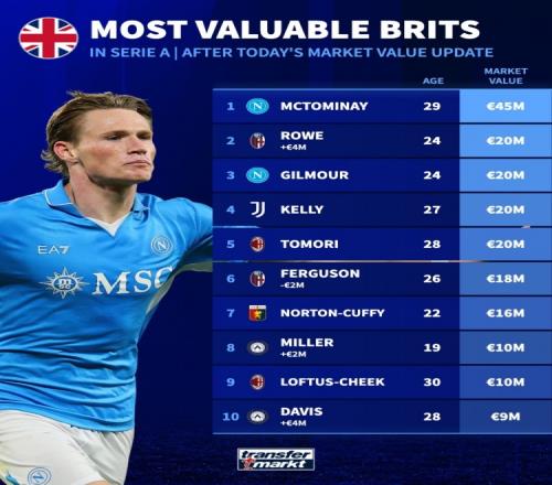 意甲英籍球員身價(jià)榜:麥克托米奈4500萬(wàn)歐居首