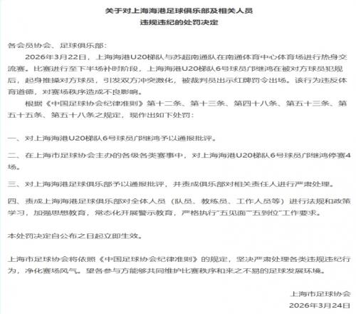 體育播報(bào)03月24日宣 上海市足協(xié)今日發(fā)布處罰公告,對海港U20球員鄺繼鴻停賽4場。海港U20與蘇超南通隊(duì)的熱身賽中,鄺繼鴻在被犯規(guī)后起身推搡對手,引發(fā)大規(guī)模沖突,被直紅罰下。
