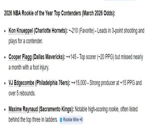 但在新秀賠率榜上,黃蜂隊的克努佩爾-210第一,弗拉格+145第二,埃奇庫姆+15000第三,換言之克努佩爾是最佳新秀的斷崖第一。