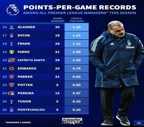 本賽季英超主帥場(chǎng)均積分:卡里克2.3分第1,圖多爾、澳波墊底