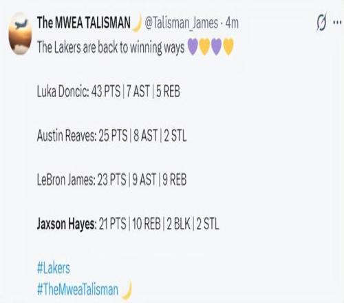 這場比賽東契奇43分7助攻6籃板,里夫斯25分8助攻,詹姆斯23分9籃板9助攻,海斯21分10籃板,只有海斯一人完成了20+10的數(shù)據(jù)。