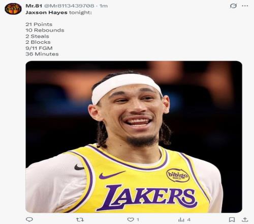 此役對于海斯來說是湖人生涯之夜:1.21分賽季新高;