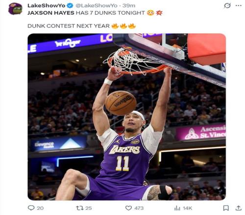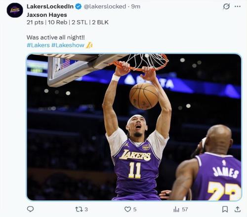 單場7次炸筐扣出湖人生涯夜!海斯21+10似鯊魚東皇賽后贊不絕口