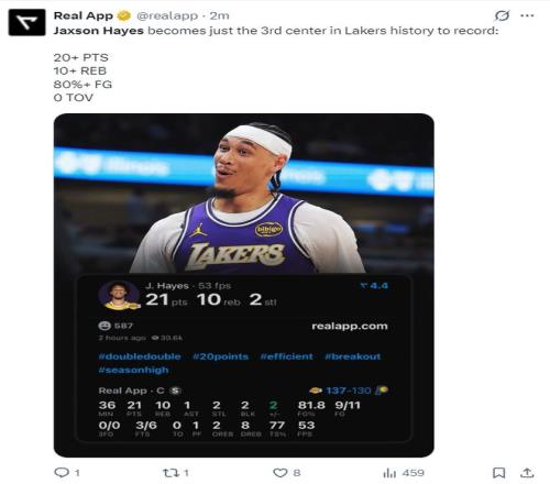 根據(jù)湖人媒體Lake Show Yo的統(tǒng)計這場比賽海斯足足扣籃7次,他9個運動戰(zhàn)進球全部來自于三秒?yún)^(qū)內(nèi),他比艾頓更喜歡打擋拆順下的戰(zhàn)術(shù),里夫斯、東契奇、詹姆斯三人都為他送出了空中接力的助攻。