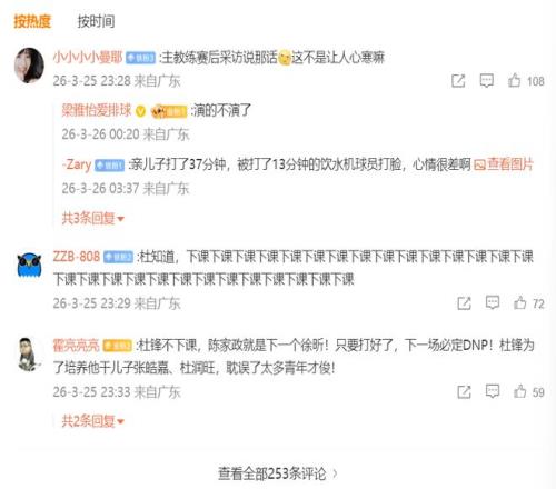 可能很多球迷不知道,胡明軒和張皓嘉是杜鋒經(jīng)紀公司旗下的球員,還有杜潤旺也是。所以不管胡明軒、張皓嘉、杜潤旺表現(xiàn)多差,還是有充足的上場時間。賽后,廣東宏遠官方賬號被球迷攻陷了,很多球迷留言杜鋒下課。