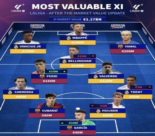 最近德轉(zhuǎn)更新了西甲球員身價,并排出了一套西甲最貴陣容。姆巴佩和亞馬爾同為2億歐元,維尼修斯和佩德里都是1.5億歐元,貝林厄姆1.4億歐元,巴爾韋德1.2億歐元,光是中前場這幾個人,身價就已經(jīng)高得嚇人。單看總身價,這套陣容確實很夸張,但身價高不等于位置搭配就一定最順,也不等于實戰(zhàn)表現(xiàn)就一定最強。把這些高身價球員放到同一套首發(fā)里,前場、中場、后防的真實戰(zhàn)斗力,真的和身價排序一樣靠譜嗎?