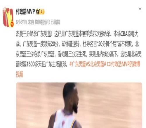 廣東隊輸在了哪?不妨來看看知名媒體人付政浩是怎么看的:本場CBA京粵大戰(zhàn),廣東男籃一度領先20分,卻慘遭逆轉,杜導名言“20分算個屁”誠不我欺。北京男籃三分絕殺廣東男籃,看似是三分定生死,實則是內線分高下。