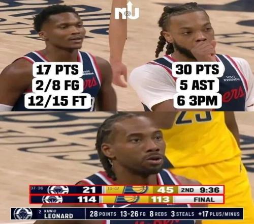 在第一節(jié)5中1只得到3分的情況下,倫納德后三節(jié)拿到了25分,其中關(guān)鍵的第四節(jié),單節(jié)拿下11分2助攻,這11分里有8分來(lái)自中投——神的武器名不虛傳。