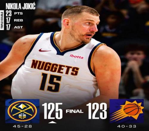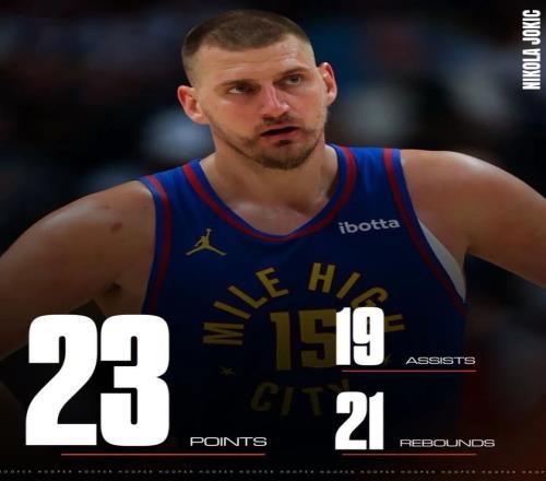 ——對陣太陽,約基奇16中9,得到23分17籃板17助攻,這是NBA歷史上第12次單場17+17+17,罕見程度不輸給單場70+