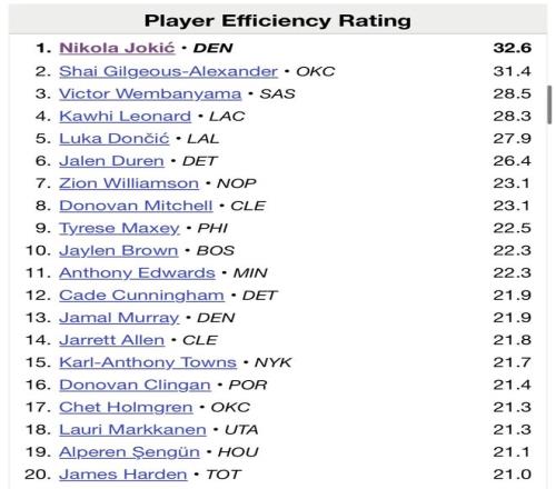 但就數據層面來說,約基奇依然是現(xiàn)役第一,一個最直接的數據就是PER值,這項(曾經)被認為是MVP風向標的高階數據,約基奇達到了32.6。