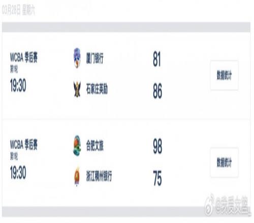 廈門銀行 81-86 石家莊英勵(lì),石家莊女籃五人得分上雙,安妮莉22分11籃板,戴維斯22分9籃板,波特12分11籃板,彭曉彤12分,王麗麗10分8助攻。廈門女籃三人得分上雙,彭詩晴23分10籃板,安娜22分11籃板,謝潑德20分。