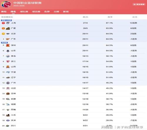 CBA最新排名!第1支季后賽球隊(duì)出爐,4隊(duì)20勝11負(fù),遼寧坐11望8