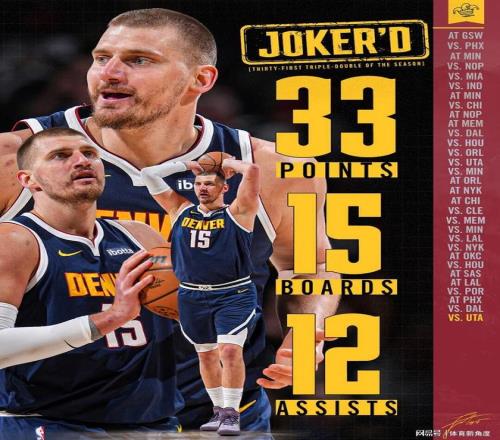 在近期緊密賽程中,四天之內(nèi)他竟要出戰(zhàn)三場比賽,且表現(xiàn)堪稱卓越:與太陽隊交鋒時,他豪取23分、17籃板17次助攻;對陣獨行俠,他再度砍下23分、21個籃板與19次助攻;面對爵士,更是火力全開,斬獲33分、15個籃板和12次助攻。