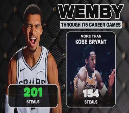 在搶斷方面,文班亞馬以201個超越了科比的154個。