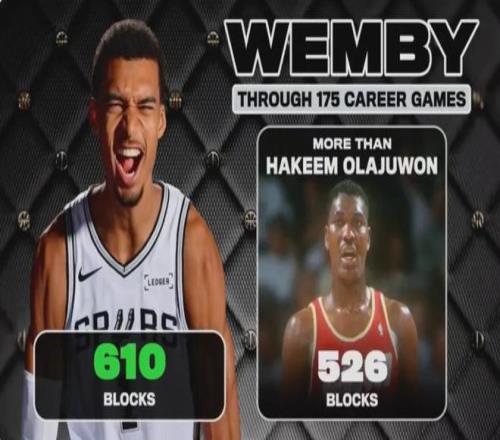 在封蓋方面,文班亞馬以610個超越了奧拉朱旺的526個。