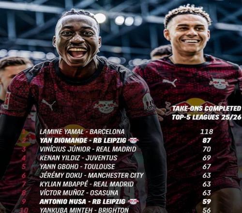 本賽季至今,揚迪奧曼德代表RB萊比錫出戰(zhàn)各項賽事29場,交出了11球7助攻的亮眼成績單。而真正讓整個歐洲為之側(cè)目的,是他令人嘆為觀止的突破能力。到目前為止,揚迪奧曼德的過人數(shù)據(jù)僅次于亞馬爾,是德甲賽場實至名歸的過人王。在本賽季五大聯(lián)賽成功過人次數(shù)榜單上,揚迪奧曼德以87次成功過人高居第二,僅次于巴薩天才亞馬爾的108次。但別忘了,亞馬爾早已是公認的頂級天賦,而這位萊比錫邊鋒,一年半前還在美國半職業(yè)聯(lián)賽掙扎。