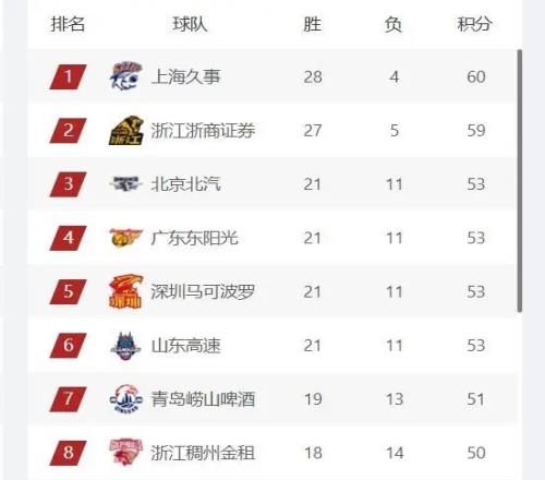 CBA最新排名,上海第1,廣廈第2,4支球隊(duì)競(jìng)爭(zhēng)常規(guī)賽前四