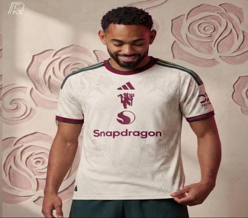 曼聯(lián)下賽季第三球衣則以米白色球衣為底,飾以蘭開(kāi)夏郡玫瑰圖案暗紋,并點(diǎn)綴深綠色和栗色。