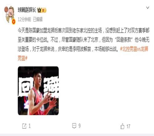 值得一提的是,在首次交鋒(1月19日),當(dāng)時(shí)回避條款是僅限出戰(zhàn)一節(jié),陳國(guó)豪首節(jié)得到5分3籃板,之后就被迫下場(chǎng)無(wú)法出戰(zhàn)后三節(jié)比賽。