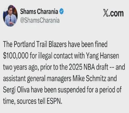 爆料王Shams:開(kāi)拓者因在選秀前與楊瀚森違規(guī)接觸被罰款10萬(wàn)美元,同時(shí)助理總經(jīng)理奧利瓦和施密茨被停薪&停職兩周。