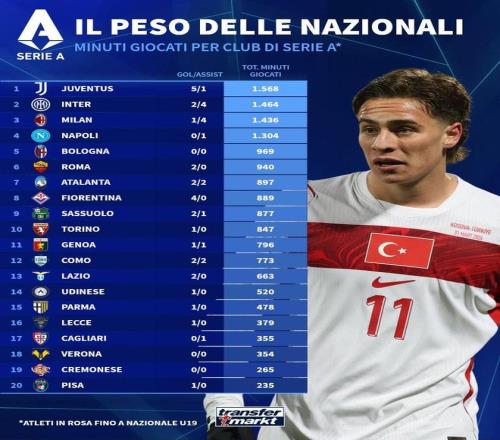 北京時間4月2日,德轉(zhuǎn)列出了意甲球隊3月國際比賽日球員出場時間排行榜,尤文圖斯球員合計出場1568分鐘位列第一,國際米蘭、AC米蘭以及那不勒斯分列二到四位。