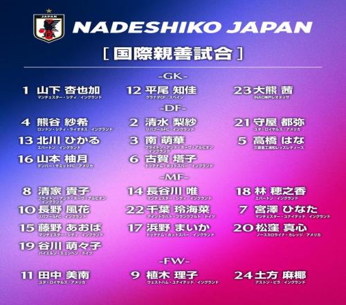 2-清水梨紗(利物浦)3-南萌華(布萊頓)4-熊谷紗希(倫敦雌獅)5-高橋花(浦和紅鉆)6-古賀塔子(熱刺)13-北川光(埃弗頓)16-山本柚月(丹佛峰會)21-守屋都彌(猶他皇家)