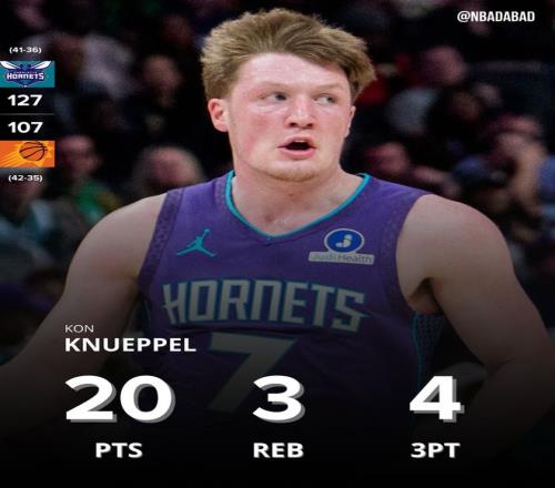 此役新秀克努佩爾32分鐘,14中7,三分9中4,罰球2中2,拿到20分3籃板2助攻,命中率50%,三分命中率44.4%,真實命中率67.2%,正負(fù)值+5。此役對于克努佩爾來說是里程碑的夜晚。