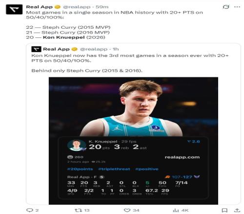 5.克努佩爾第20場達(dá)到20分+命中率50%+三分命中率40%+罰球命中率100%的場次排歷史第三,僅次于2016年的庫里與2015年的庫里,要知道克努佩爾是新秀,而庫里已經(jīng)是進(jìn)入巔峰的他。