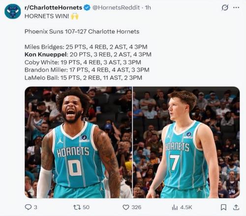 這場比賽邁爾斯-布里奇斯拿到25分4籃板,克努佩爾20分4個三分,米勒17分4籃板4助攻,鮑爾15分11助攻,科比懷特19分4籃板,格威10分7籃板。本賽季年輕的黃蜂已經(jīng)成為東區(qū)的攪局者。