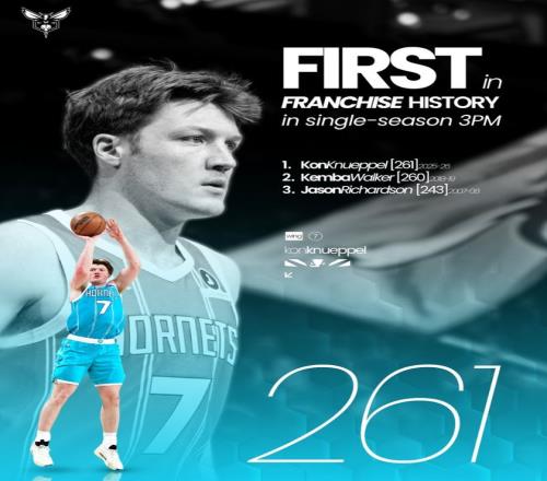 此役克努佩爾再度命中4個三分球,他的單賽季三分命中數(shù)已經(jīng)來到261個,他超越了18-19賽季的肯巴-沃克260個的隊史紀(jì)錄,1.他成為隊史單賽季三分命中榜第一人。