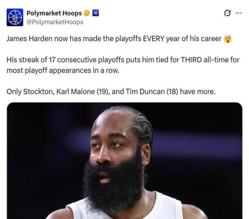 值得一提的是,最后關(guān)頭,哈登單打命中幫助騎士收割了比賽。同時,哈登個人也鎖定季后賽,個人生涯17個賽季從未缺席季后賽。